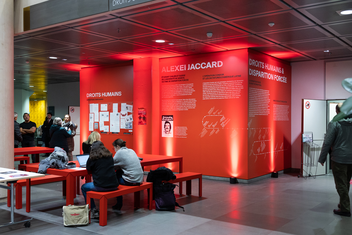 The entrance to the auditorium, now named after Alexei Jaccard, has become a place of information and reflection. The permanent wall display recounts Alexei Jaccard’s story through a block of text and a graphic timeline, juxtaposing the chronology of his life with key political events in Latin America from 1952 to 2022. The timeline aims to connect these events, linking a personal story to its wider political and historical context.