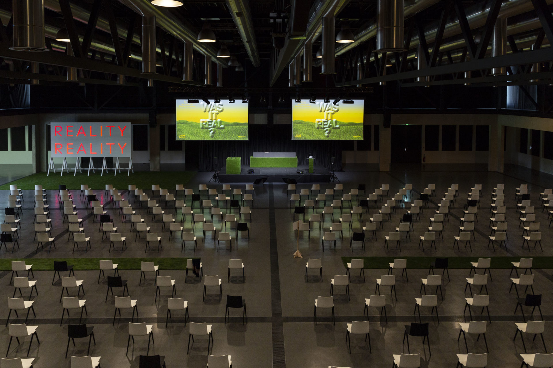 Pour les webinaires en direct filmés dans leurs bureaux, nous avons créé une scénographie minimaliste qui complétait l’espace, avec une représentation typographique grande échelle de leur logo.