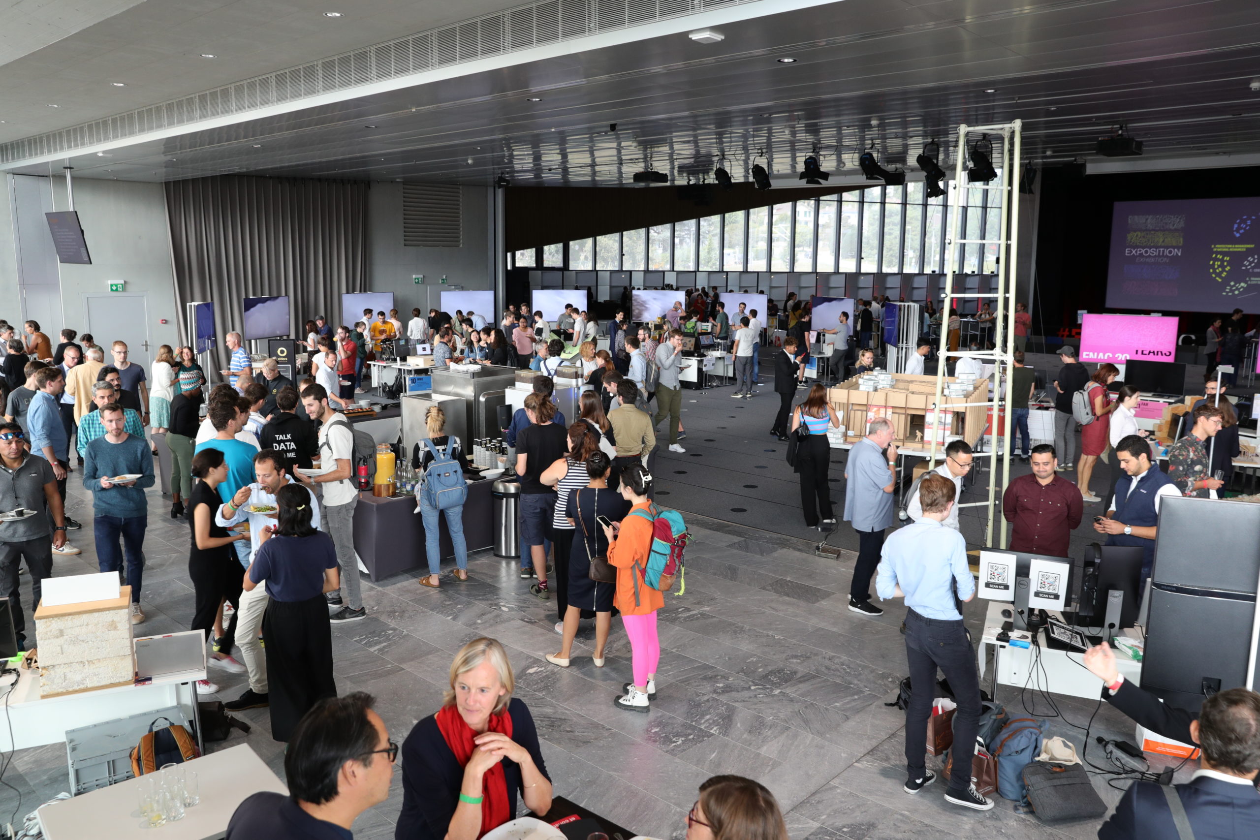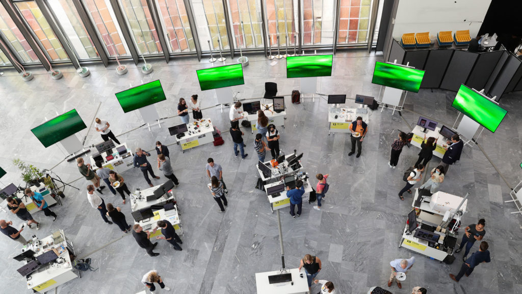 Entourée de ces écrans, l’exposition a invité 60 laboratoires à présenter leurs résultats au Swiss Tech Center. Les laboratoires étaient regroupés en quatre sections, chacune correspondant à des domaines de travail thématiques. Nous avons délimité chaque section avec une rangée d’écrans, définissant l’aire d’exposition. Chaque section était distinguée par une couleur spécifique, un nom, et la disposition des tables d’affichage au sein de l’espace des écrans.